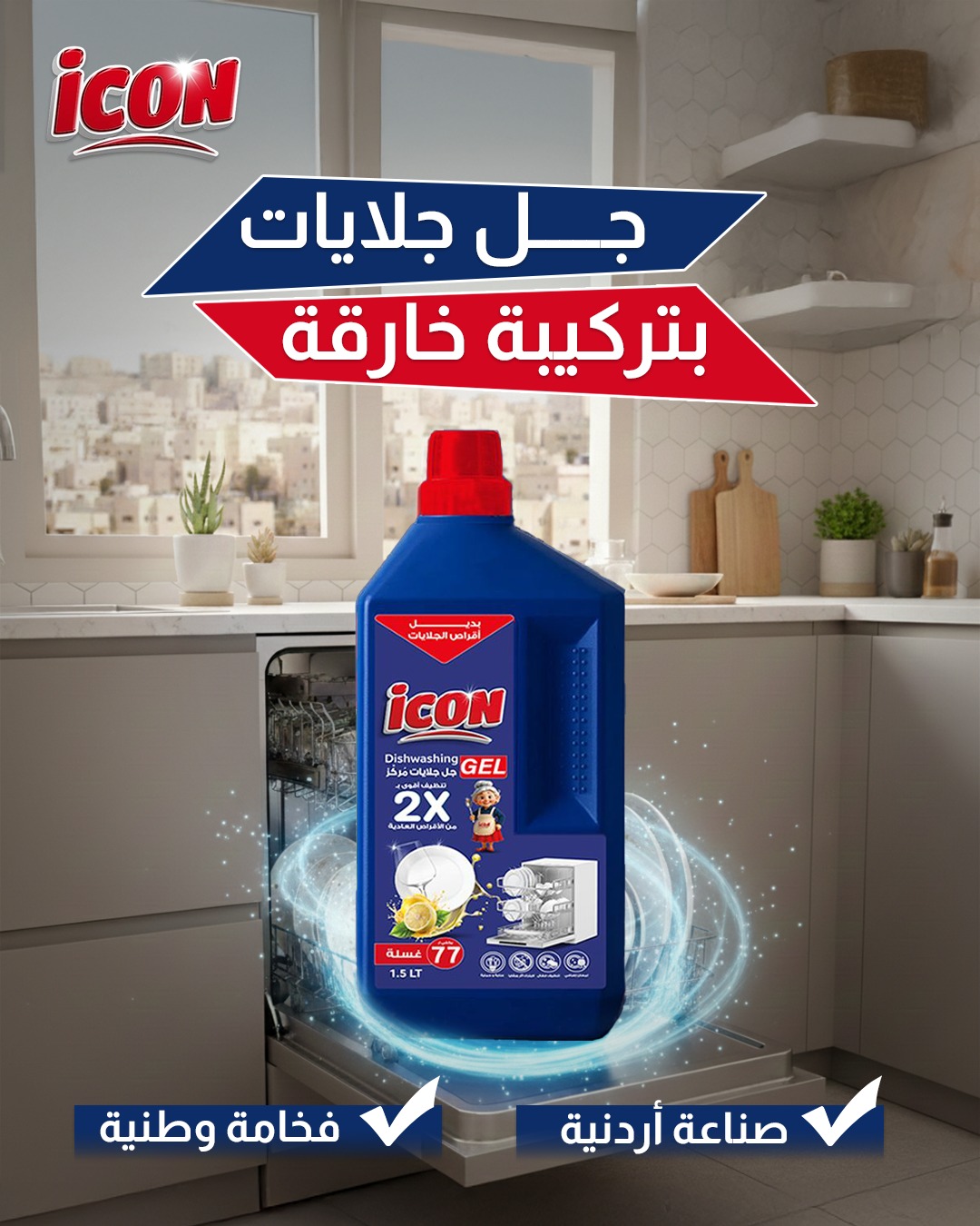 ICON Dishwashing Gel is a high-quality dishwashing solution proudly manufactured in Jordan.